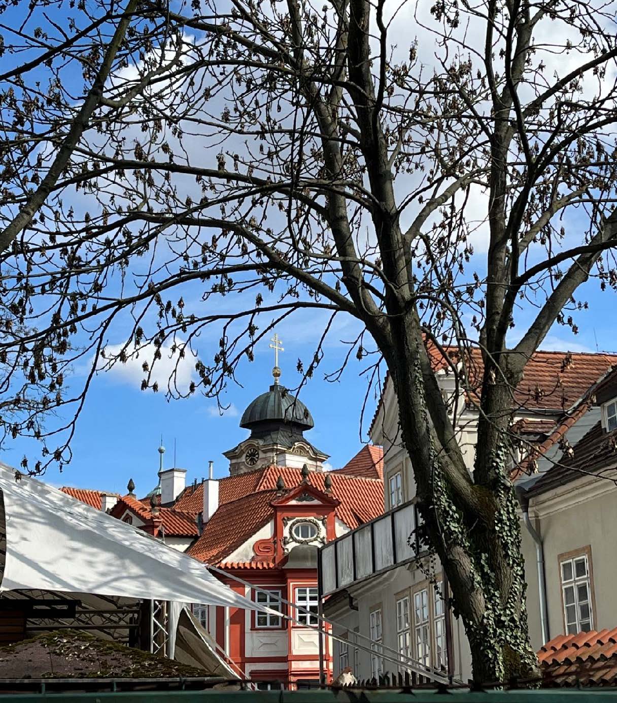 Vanaf de speelplaats lukte het me om het zomertoneel van het Ungelttheater en de koepel van de militaire kerk van St. Johannes van Nepomuk te fotograferen. Weldra nemen we afscheid van De Nieuwe Wereld en dalen we af in de Hertengracht. Van daaruit lopen we weer terug naar de Lumbe-villa, of beter gezegd in de richting van daarvan. Deze werd ooit bewoond door presidenten Václav Klaus en Miloš Zeman, waardoor het niet mogelijk is daar binnen te komen. We genieten van het Masaryk-uitzicht, dat voor de president werd opgericht door zijn Sloveense architect Jože Plečnik. Hij vormde een cirkel van stenen rond een lindeboom, waarop je kunt zitten en de wereld observeren.